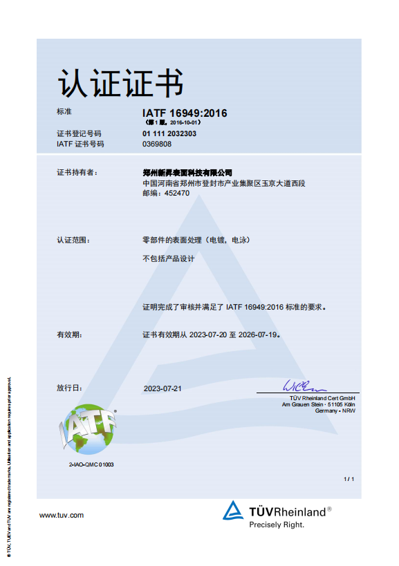 2023年7月取得德國萊茵TÜV頒發的IATF 16949:2016質量體系認證證書